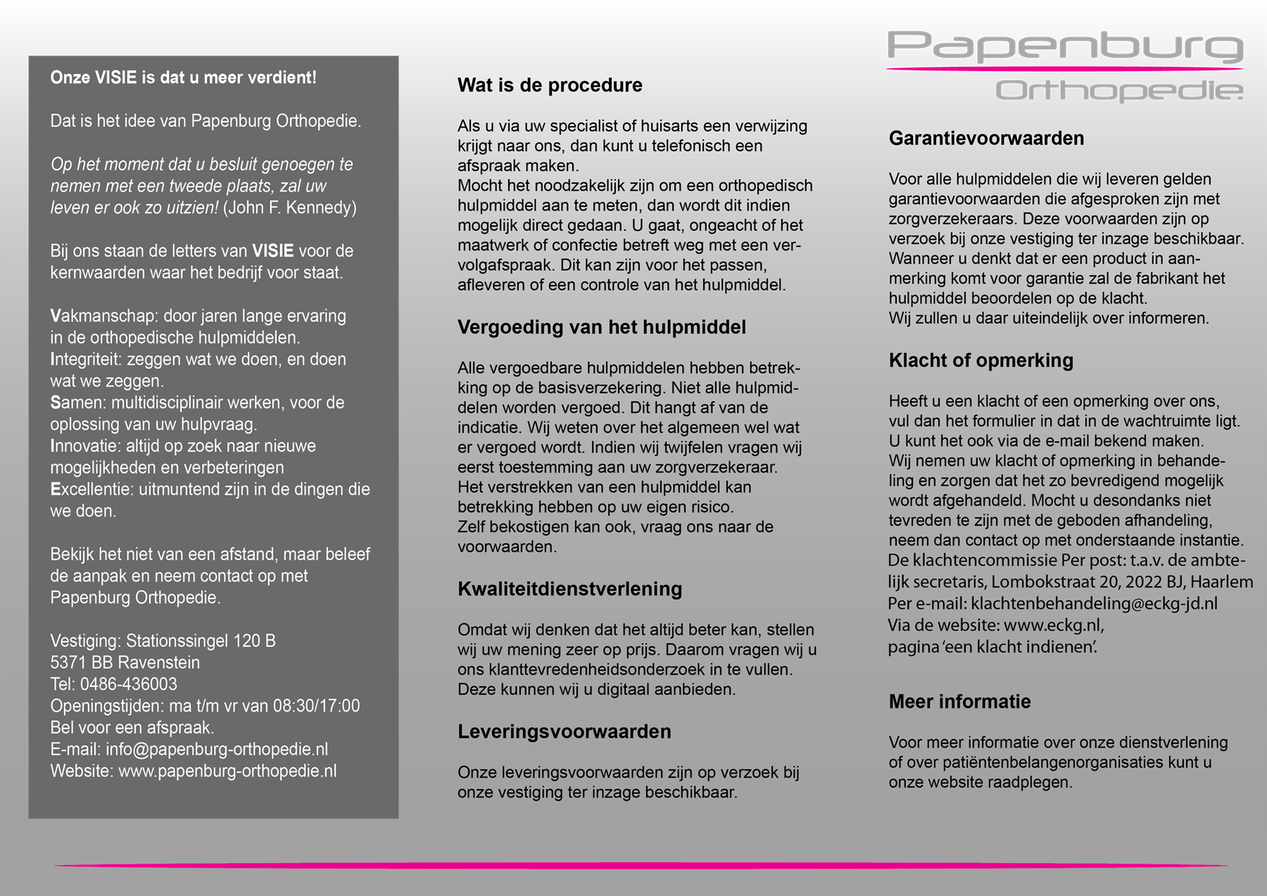 Deze website maakt gebruik van cookies De website van Papenburg Orthopedie BV gebruikt functionele cookies. In het geval van het analyseren van websiteverkeer of advertenties, worden ook cookies gebruikt voor het delen van informatie, over uw gebruik van onze site, met onze analysepartners, sociale media en advertentiepartners, die deze kunnen combineren met andere informatie die u aan hen heeft verstrekt of die zij hebben verzameld op basis van uw gebruik van hun diensten.